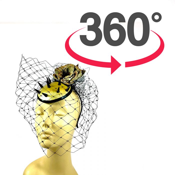 Rosa, pétalos troquelados en piel reciclada de bovino montada sobre base casquete lágrima coronado por tachuelas metálicas en negro, redecilla algodón rombo gigante. Forro sintético en lentejuelas